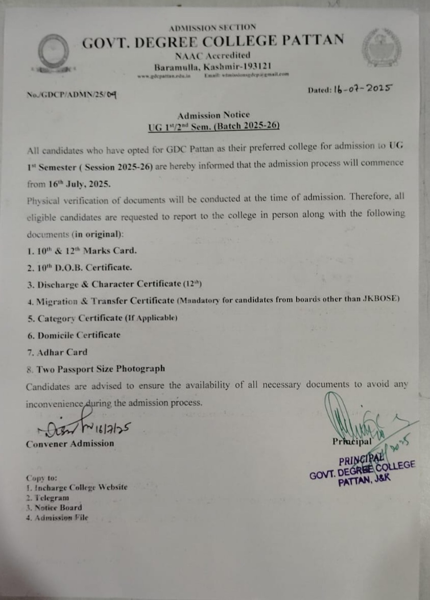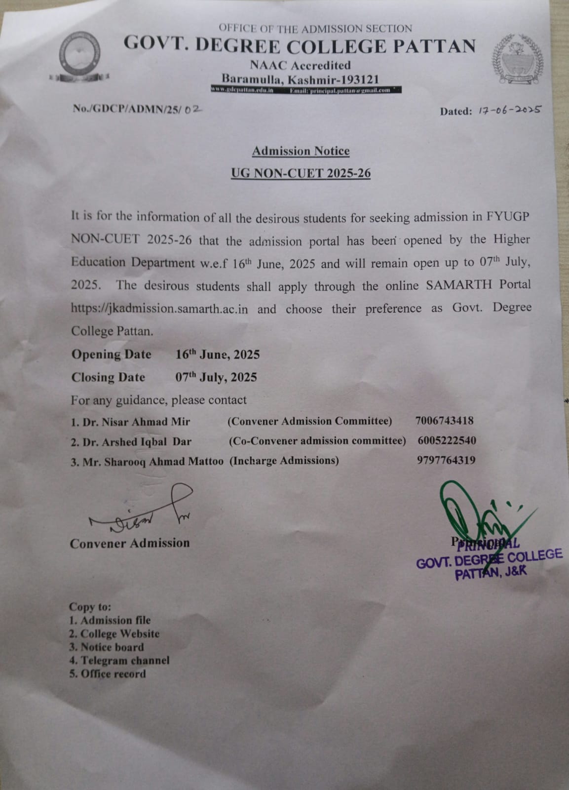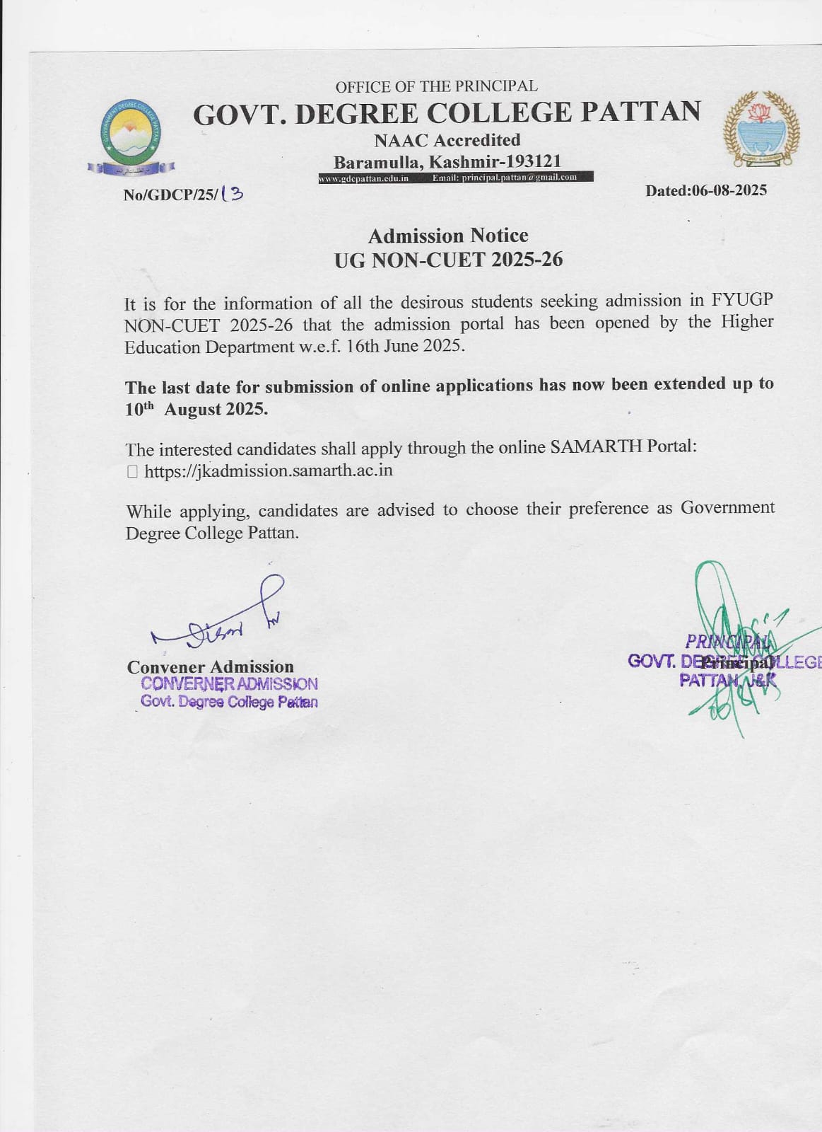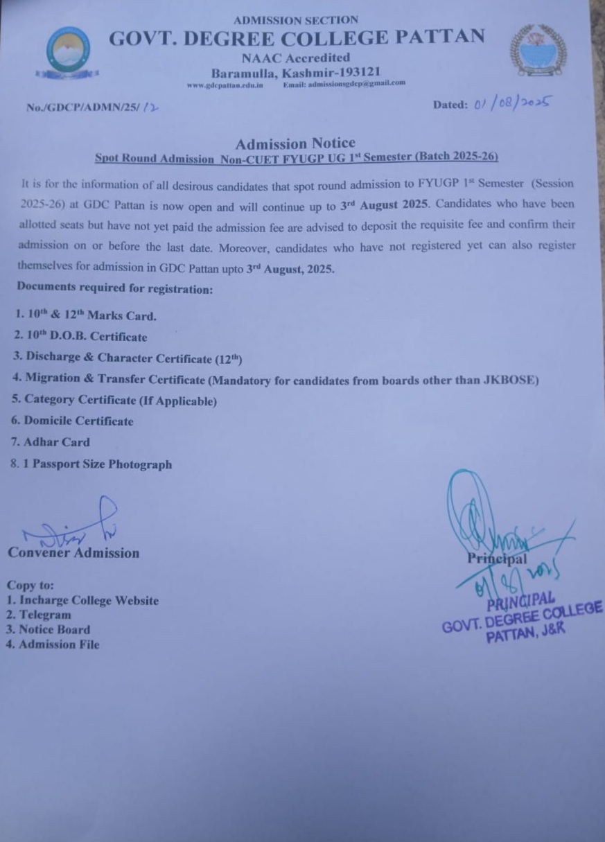 The Government Degree College Pattan also known as GDC Pattan is a University of Kashmir affiliated degree college located at Pattan in Baramulla district UT of Jammu and Kashmir.It is about 27 km (17 mi) from district headquarter Baramulla and about the same distance from the state summer capital Srinagar.The college is recognised by University Grants Commission of India under sections 2(f) and 12(b) of UGC, Act 1956. The college underwent first cycle of NAAC inspection in November 2021 and was graded 'C' grade with the score of 2.0 on 7 point scale. ...