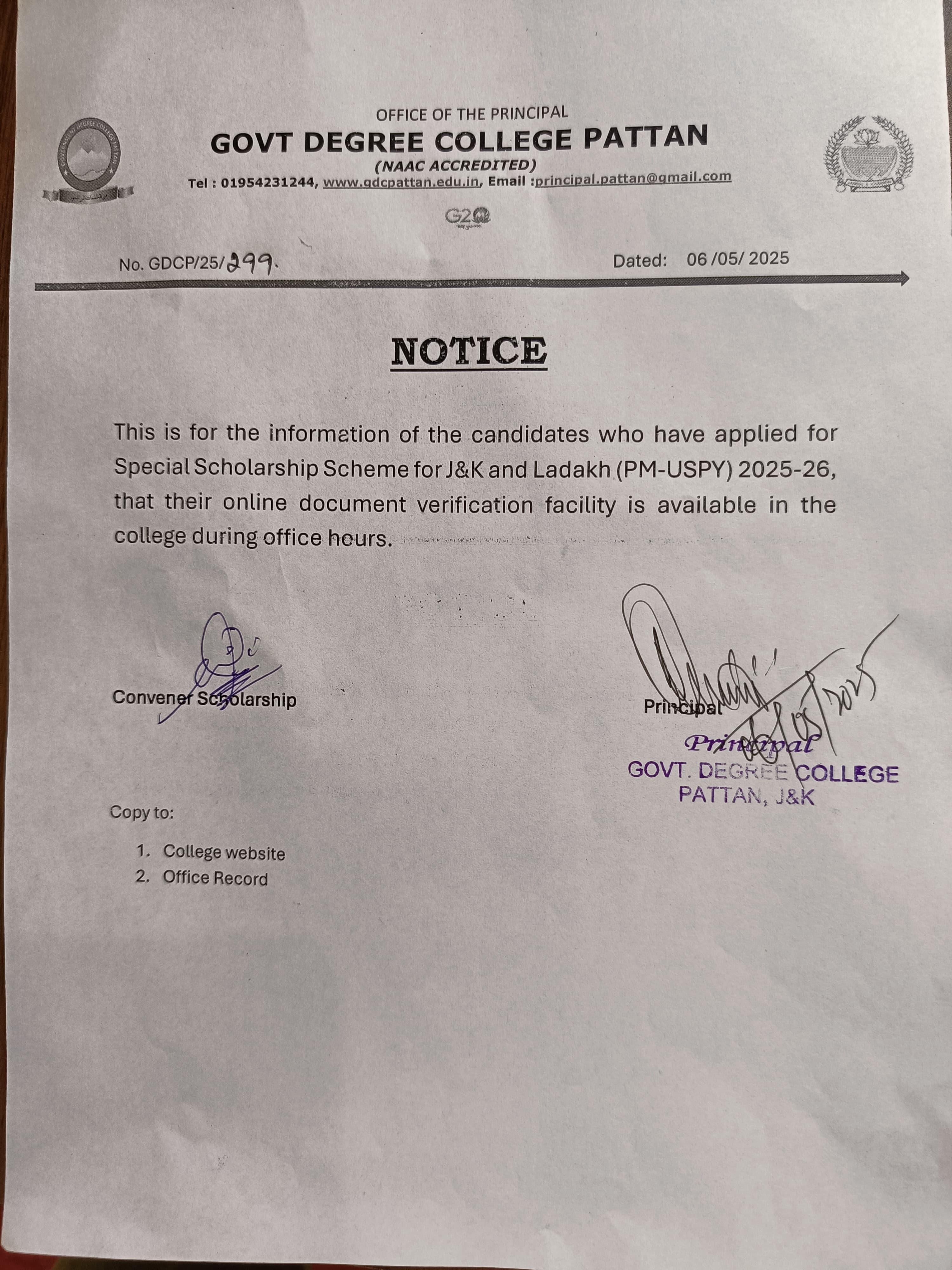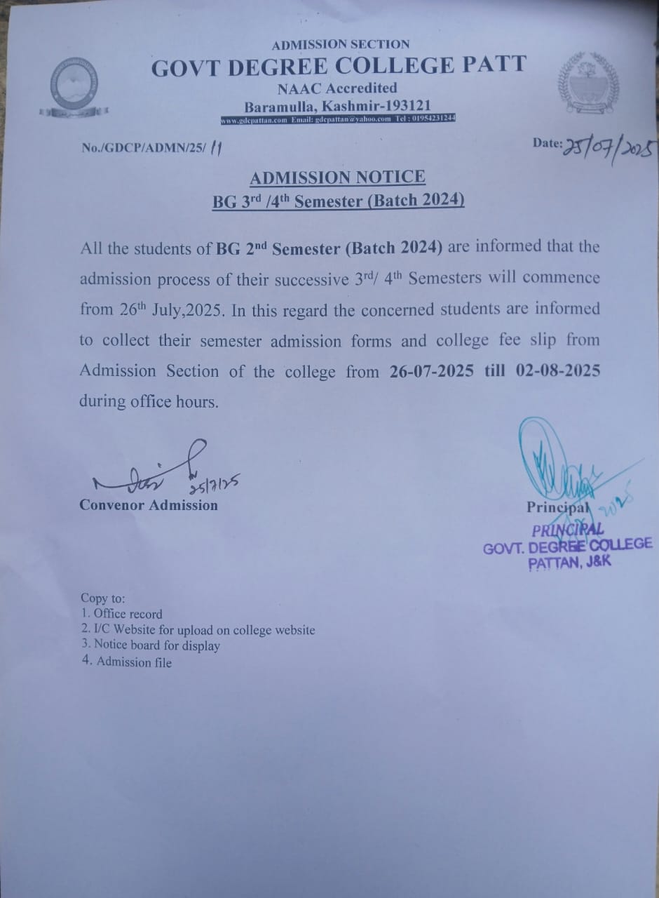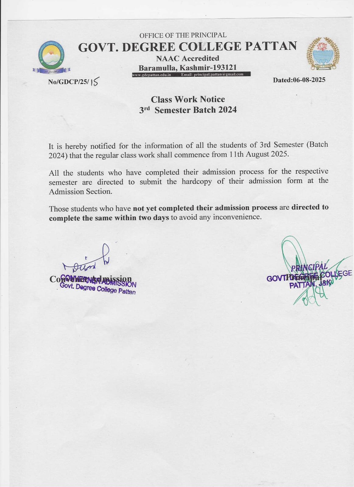The Government Degree College Pattan also known as GDC Pattan is a University of Kashmir affiliated degree college located at Pattan in Baramulla district UT of Jammu and Kashmir.It is about 27 km (17 mi) from district headquarter Baramulla and about the same distance from the state summer capital Srinagar.The college is recognised by University Grants Commission of India under sections 2(f) and 12(b) of UGC, Act 1956. The college underwent first cycle of NAAC inspection in November 2021 and was graded 'C' grade with the score of 2.0 on 7 point scale. ...