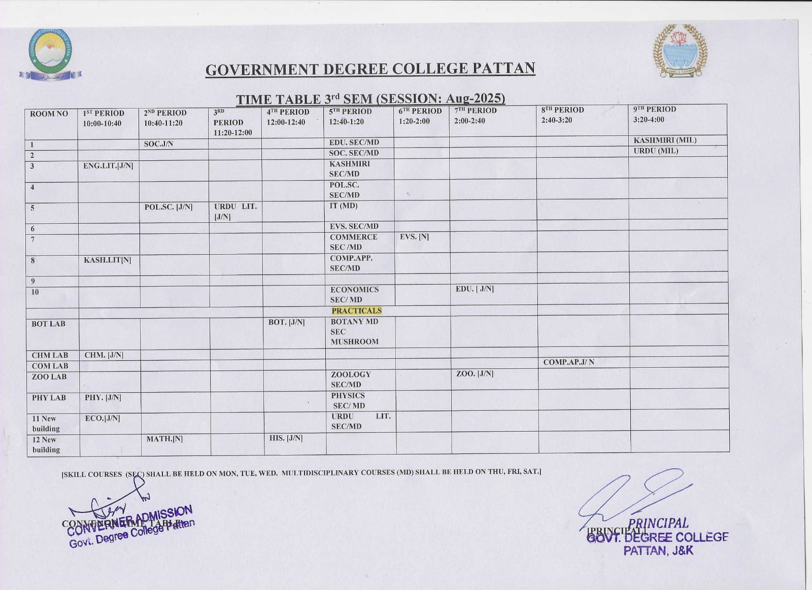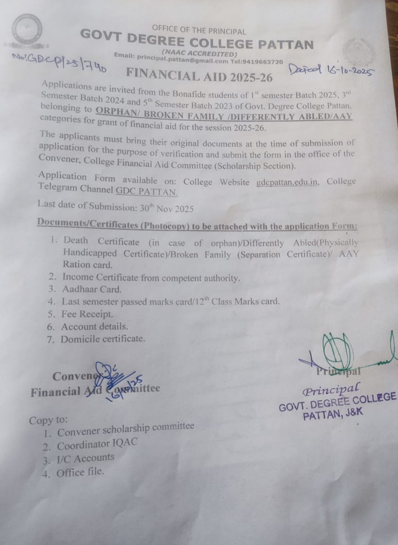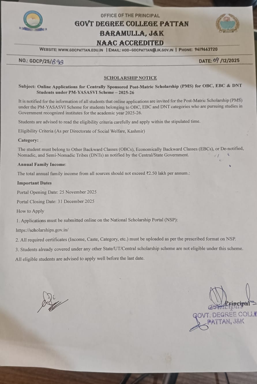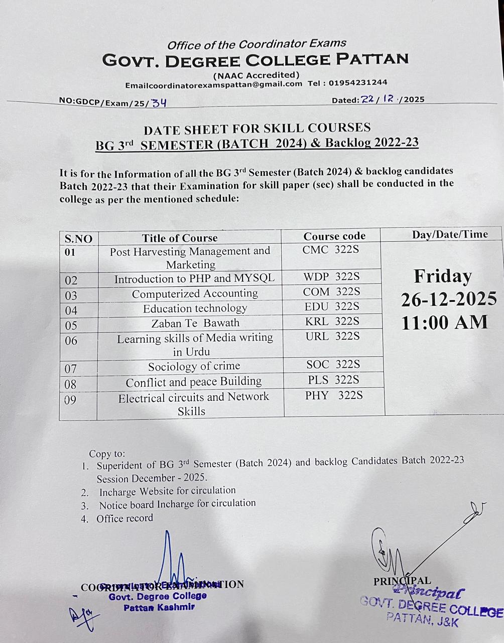 The Government Degree College Pattan also known as GDC Pattan is a University of Kashmir affiliated degree college located at Pattan in Baramulla district UT of Jammu and Kashmir.It is about 27 km (17 mi) from district headquarter Baramulla and about the same distance from the state summer capital Srinagar.The college is recognised by University Grants Commission of India under sections 2(f) and 12(b) of UGC, Act 1956. The college underwent first cycle of NAAC inspection in November 2021 and was graded 'C' grade with the score of 2.0 on 7 point scale. ...